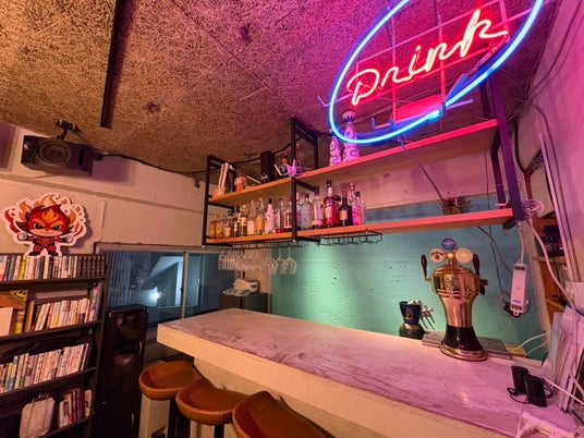 バーカウンターやミラーボール、シャンデリアなど、あえて元シーシャBARの構造を残しています。