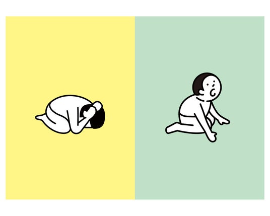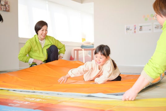 どこでも地震体験マット「YURETA」による、こども園で想定される震度を体験する幼児。ダンゴムシのポーズでは転がってしまう