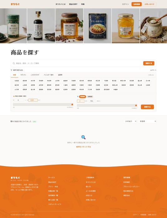 地域(47都道府県・市区町村)×カテゴリ×アレルギー×価格帯×保存温度帯など、複数の軸を掛け合わせた絞り込みが可能です。飲食店での食材仕入れや、イベント向けご当地グルメの発掘など、全国の商品を一か所で横断検索・比較できるため、まちもぐで候補を絞り込み「当たりをつけてから現地を訪問する」入り口としてもご活用いただけます。