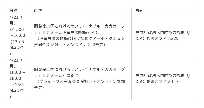 JICA(独立行政法人国際協力機構)(理事長:田中明彦)が事務局を務める「開発途上国におけるサステイナブル・カカオ・プラットフォーム」(以下、プラットフォーム)は、2025年4月8日、 プラットフォーム参加団体による児童労働撤廃に向けた具体的な取組状況をまとめた「児童労働のないカカオ産業に向けた共創レポート 2023/2024 」(以下、本レポート)を発表しました。