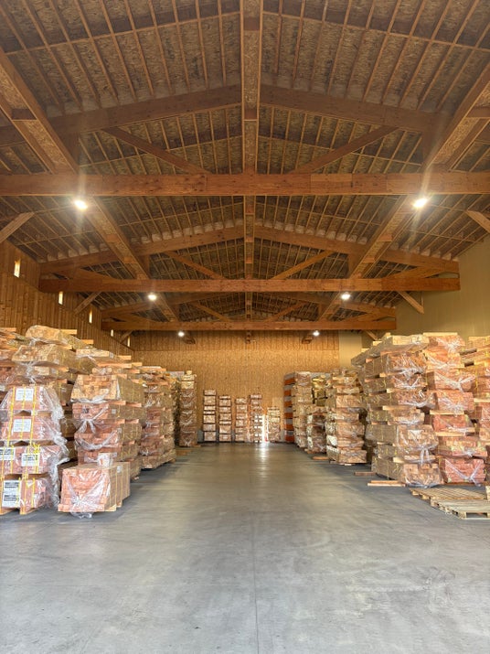 丹波篠山工場内では、倉庫棟・横架材棟・柱材棟の出入り口のスライド吊り戸前に新たに荷捌き屋根を増設しました。雨や雪など悪天候時の作業効率も改善され、より安定した生産体制が構築されています。