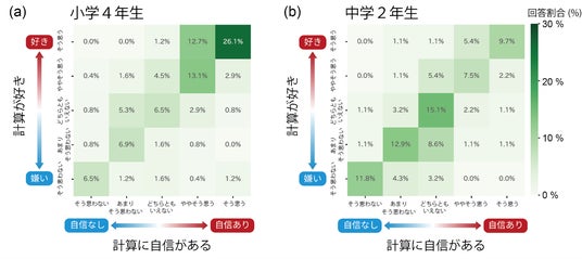 図1 日本の小学4年生(a)と中学2年生(b)における「計算が好き」と「計算に自信がある」の回答分布 「あなたは計算が好きですか(縦軸)」および「あなたは計算に自信がありますか(横軸)」という質問に対する、回答(そう思う、ややそう思う、どちらともいえない、あまりそう思わない、そう思わない)の割合(%)を示す分布。