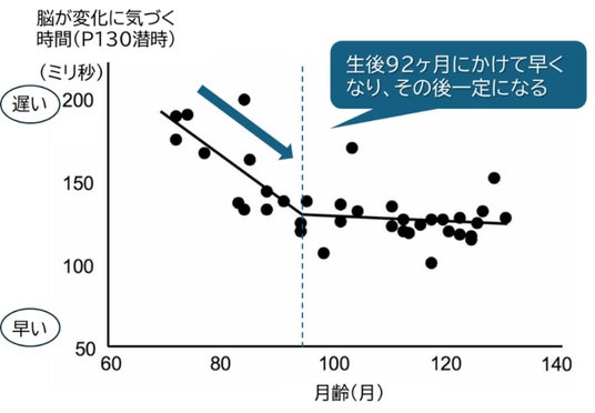 ・この脳活動の早さは月齢とともに早くなり、生後92ヶ月にかけて急速に「変化に気づく」能力が発達することが分かりました。