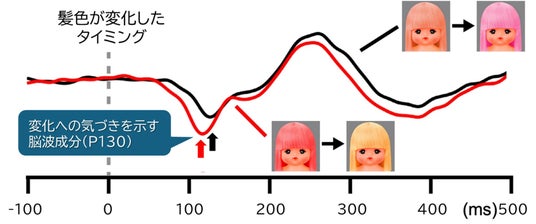 刺激の変化に伴って観察される脳活動です。視覚、聴覚、体性感覚などのモダリティーによらずに、安定した脳活動として記録することができます。本研究ではお人形画像の髪の毛の色変化に伴う変化関連脳活動を計測しています。