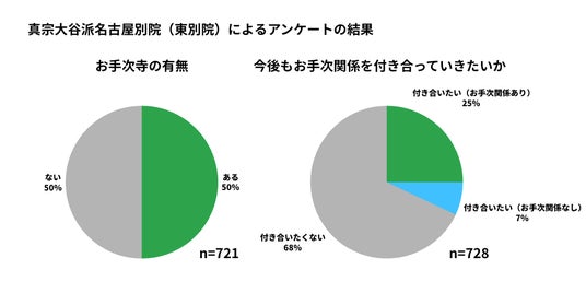 東別院が実施した独自アンケートによると、「お手次寺院との関係がある」と回答した人と「ない」と回答した人はおよそ半々でした。そのうち「今後も付き合いたい」と考える人は全体の25%、「関係はないが今後付き合いたい」が7%にとどまり、約70%は「付き合いたくない」と回答しています。