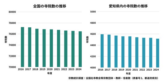 文化庁が公表した「宗教統計調査」(2024年12月時点)によれば、全国の寺院数は76,484カ寺で、2016年度と比較すると770カ寺減少しています。愛知県においても同様の傾向が見られ、2024年度の寺院数は4,517カ寺と、8年間で79カ寺の減少が確認されています。