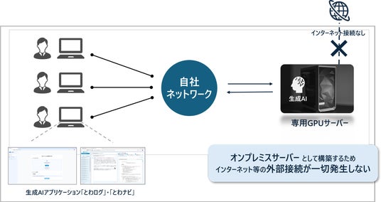 東和銀行に導入されたAIアプリケーション「とわログ」と「とわナビ」は、厳格なセキュリティ要件を満たすべく、クラウドではなくオンプレミス環境での運用を前提に構築されています。インターネットを介さずに生成AIを利用できるため、外部からの不正アクセスや情報漏洩のリスクを最小限に抑えることが可能です。
