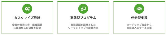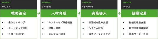 本サービスは、企業のAI活用レベルや組織特性に応じて設計されるカスタマイズ型プログラムであり、以下のような要素を組み合わせて提供します。
