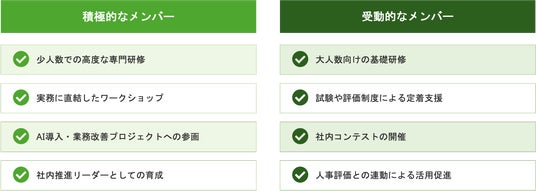 MIOでは、AI活用の定着には、「積極的なメンバー」と「受動的なメンバー」へのアプローチを分けることが不可欠であると考えています。