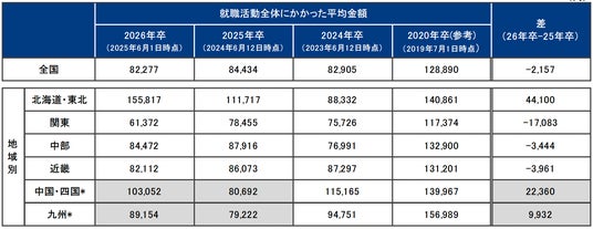 今回は、学生が就職活動に使用した金額についてレポートします。2026年卒学生の6月1日時点での「就職活動全体にかかった平均金額」は、8万2,277円となりました。前年に比べ約2,000円減少していますが、「交通費」「宿泊費」の項目を見ると平均金額は増加しています。地域別に「就職活動全体にかかった平均金額」について見ると、最も高い「北海道・東北」では前年よりも約4万4,000円増加した一方、最も低い「関東」では約1万7,000円減少しているなど、地域による差が大きい状況です。6月までに経験した各プロセスの参加形態では、最終面接にて「対面のみ」の割合が前年より増加しており、特に遠方への移動を伴う学生にとって、近年の物価高の影響も相まって就職活動における費用負担が大きくなっていることも考えられます。企業の皆さまには、今後も各プロセスごとにオンラインと対面を使い分けたり、遠方の学生には交通費の支給を検討したりするなど、学生の経済的な負担を考慮いただくような工夫をお願いいたします。学生との出会いの機会を広げるためにも、柔軟で配慮ある採用活動を行っていただけますと幸いです。