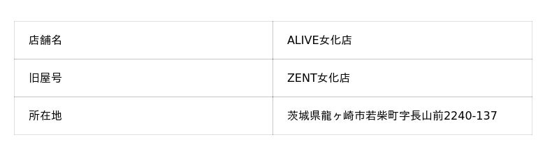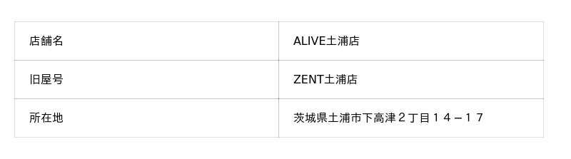 3店舗はいずれも同日に「ZENT」から「ALIVE(アライブ)」へ屋号を変更し、店内外装飾のリニューアルとともに新たなスタートを切ります。
