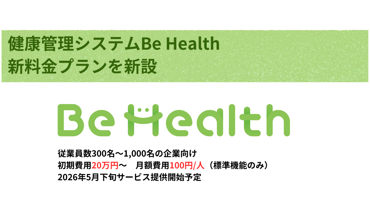ITを活用したヘルスケア事業を展開する、株式会社エヌ・エイ・シー・ケア(所在地:東京都千代田区、代表取締役:山崎 直人)は、同社の提供する企業向け健康管理システム「Be Health(ビーヘルス)」(以下「Be Health」)において、従業員数300名~1,000名規模の企業を対象とした新料金プランを新設し、2026年5月下旬よりサービスの提供を開始することを発表しました。