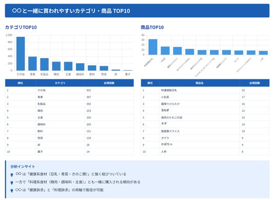 「どの商品が一緒に購入されやすいか」「キャンペーン後にどのカテゴリが伸びたか」などを自動で抽出し、レポートとして可視化します。
