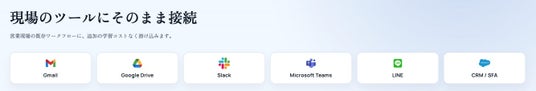 Gmail、Google Drive、Slack、Microsoft Teams、LINE、CRM/SFAなど、営業現場で使用されている既存ツールにそのまま接続可能です。