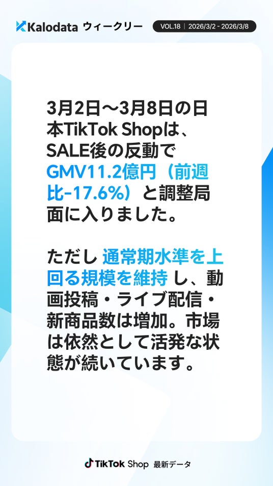 TikTok Shopデータ分析サービスKalodata Japan(運営:株式会社Kalowave Japan)の最新データによると、2026年3月2日~3月8日の日本TikTok Shop市場は前週の大型セールの反動によりGMV11.2億円(前週比−17.6%)となりました。