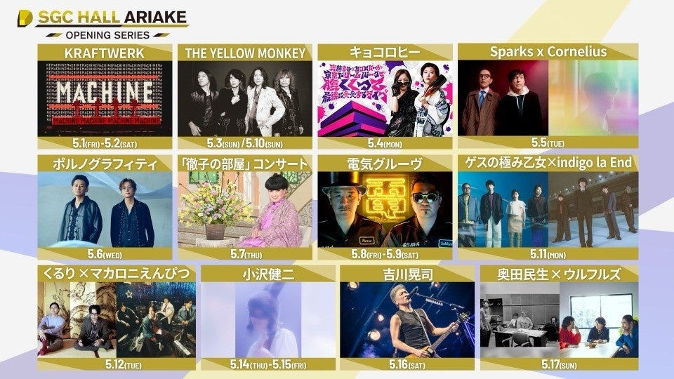【SGC HALL ARIAKE 】オープニングシリーズ「SGCホール有明」では、『こけら落としプレミアシリーズ』に続き、『オープニングシリーズ』を開催します。本シリーズでは、「KRAFTWERK」「THE YELLOW MONKEY」「SPARKS×Cornelius」「ポルノグラフィティ」「電気グルーヴ」「ゲスの極み乙女×indigo la End」「くるり×マカロニえんぴつ」「小沢健二」「吉川晃司」「奥田民生×ウルフルズ」など、ワンマンライブや対バンライブ、「『徹子の部屋』コンサート」「キョコロヒー」の番組イベントといった豪華コンテンツをラインナップ。
