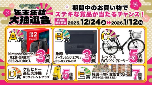 TOHOピクス株式会社(本社:福島県郡山市、代表:馬場 栄一郎)が運営する商業施設「オリエントパーク日和田」では、2025年12月24日(水)から2026年1月12日(月)まで、毎年恒例の年末年始大抽選会を開催いたします。