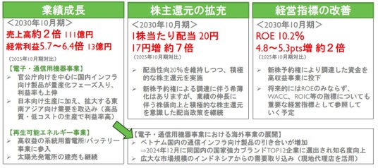 2030年10月期に売上高111億円、経常利益13億円を達成し、2025年10月対比で売上高が約2倍、経常利益が5.7~6.4倍という大幅な成長を計画しております。