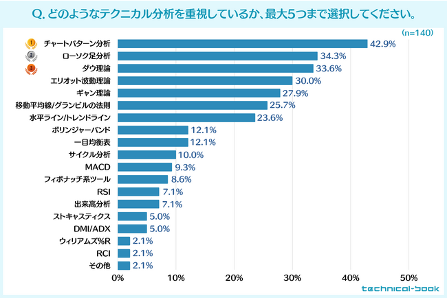 また、最も人気のテクニカル分析はチャートパターン分析で、投資家の42.9%が重要視しているという結果になりました。チャート形状から将来の相場展開を予測するチャートパターン分析はシンプルなので、チャートを分析する際に活用しやすい側面があるのかもしれません。