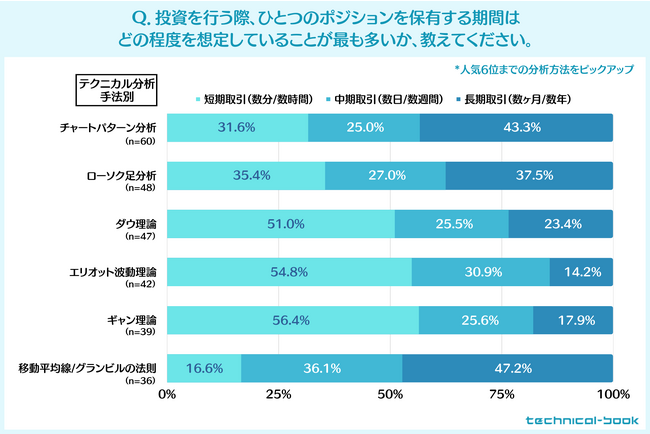 上のグラフは、投資における取引スパンを、投資家が使用している割合が1位~6位だったテクニカル分析毎に集計したものです。このグラフを見てみると、テクニカル分析の手法によって取引スパンに差があることが読み取れます。