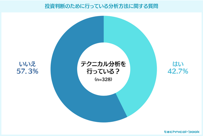 投資判断をするために行っている分析方法について質問したところ、テクニカル分析を行っている人の割合は42.7%、テクニカル分析を行っていない人の割合は57.3%でした。テクニカル分析を活用している投資家は少なく、活用していない人の方が多数派のようです。