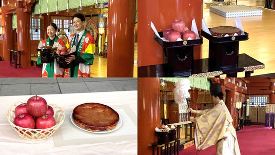一般社団法人青森県りんご対策協議会(青森県青森市)は、11月21日(木)に江戸総鎮守 神田明神(東京都千代田区)にて、青森県産りんごの奉納と秋・冬シーズンに人気のスイーツ「タルトタタン」のご祈祷を行いました。タルトタタンには、「失敗を諦めずにひっくり返して成功に結びつけた」という誕生エピソードがあります。今回は恋愛に悩んでいる方や片思いの方へ、諦めなければ状況が好転して思いが成就できるという思いを込めて、縁結びの神社として有名な「神田明神」での開催となりました。祈祷には、一般社団法人青森県りんご対策協議会事務局長 高澤 至と、L’Atelier du Gateau Français主宰 パティシエの細井 奈緒子 先生が参列しました。ご祈祷いただいたタルトタタンは、細井先生が製作。タルトタタンを食べた方に良いご縁があるようにと、直径24cmのタルトタタンが祈祷されました。