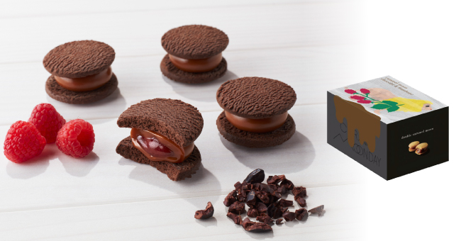 サクサクのココアクッキーで、フランボワーズソース入りの濃厚なキャラメルをサンドした限定商品です。