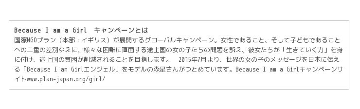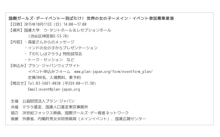 Because I am a Girlキャンペーンを展開する国際NGOプラン・ジャパンは、2015年10月11日(日)、国際ガールズ・デーイベント「羽ばたけ!世界の女の子」を、国連大学ウ・タントホール(東京・渋谷)にて開催します。メイン・イベントでは、Because I am a Girlエンジェルをつとめるモデルの森星さんからのメッセージや映画『わたしはマララ』日本初特別試写会の他、インドから来日する女の子によるプレゼンテーション、世界の女の子のために私たちにできることを考えるトークが催されます。 (参加お申し込みの受付は終了いたしました)