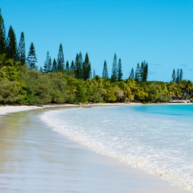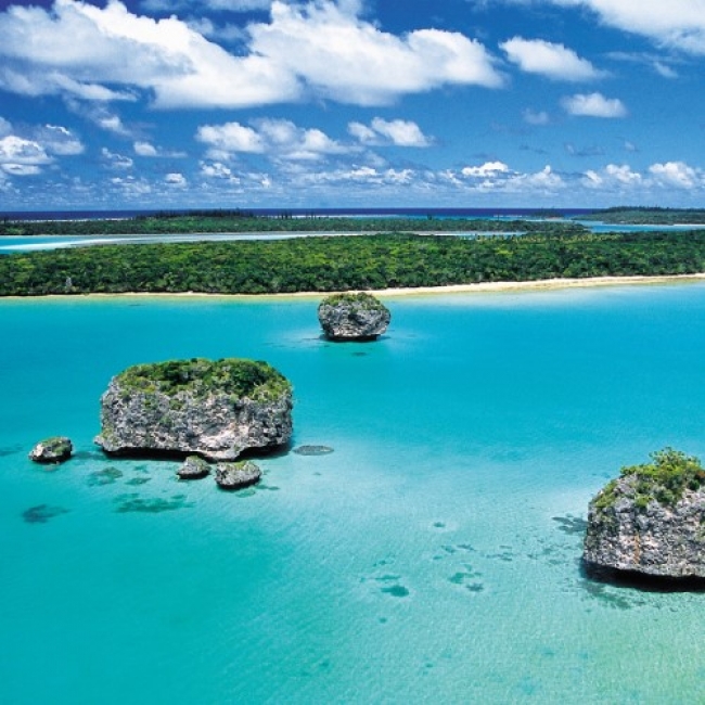 南太平洋の宝石箱とたとえられるイル・デ・パンは、ヌメアから飛行機で20分ほどの場所に位置する、ニューカレドニアの離島です。島の周りの海は、世界遺産に登録されたコバルトブルーの美しいラグーンに囲まれ、南洋杉が立ち並ぶ景色が特徴です。魚が多く生息する天然プールと呼ばれるピッシンヌ・ナチュレル、きめ細やかな純白の白砂で有名なクト・ビーチ、その背中合わせにあるエメラルドブルーのカヌメラ・ビーチ、波のないキノコ型の奇岩がユニークなウピ湾など、様々な観光スポットがあります。