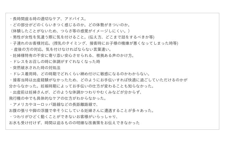 ブライダル業界では、新婦さんの4人に1人は妊婦という現状があります。またデパート、レストラン、ホテル、飛行機、電車、どこにでも妊婦が使用する一方で妊娠中のお客様への接客に不安を抱えている人が多くいることが分かりました。多くの方が妊婦への対応に不安や戸惑いを感じたことがあるという現実があります。