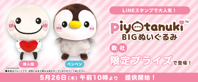LINEスタンプで大人気の『ぴよたぬき』より、人気のキャラクター「ぺんぺん」・「棒人間」が数社限定プライズ「【数社限定】ぴよたぬき BIGぬいぐるみ」(全2種)となってクラウドキャッチャーに登場します!