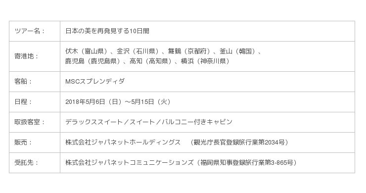ヨーロッパ最大のクルーズ会社で、自主クルーズとして初めて日本発着を行う客船MSCスプレンディダ(全長333.3m、客室数1,637部屋)をブロックチャーター。ジャパネットオリジナルのサービスをお届けいたします。