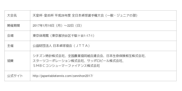 SMBCコンシューマーファイナンス(本社:東京都中央区銀座、社長:幸野 良治 以下 当社)は、2017年1月16日から22日まで東京体育館で開催される「天皇杯・皇后杯 平成28年度 全日本卓球選手権大会(一般・ジュニアの部)」(以下 全日本卓球選手権大会)に協賛いたします。