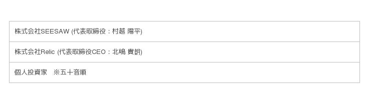 本ラウンドにおける第三者割当増資の引受先は以下のとおりです。