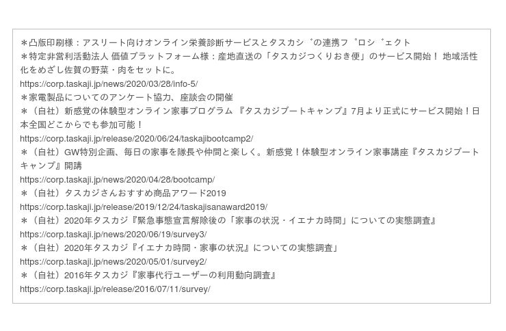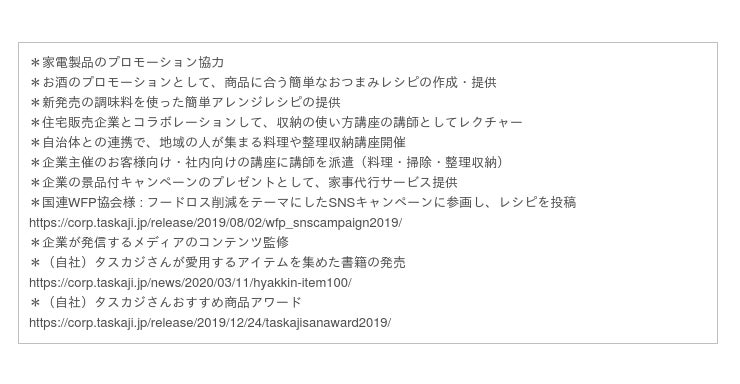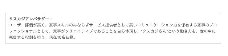 多彩な家事スキルを活かして働くハウスキーパー(タスカジさん)と、家事をお願いしたい人とをつなぐ、シェアリングエコノミーの家事代行マッチングサービスです。2014年のサービスリリース以来、「核家族から拡大家族へ、新しい家族の形を再定義する」というビジョンを掲げ、一貫して家庭のあらゆる家事の課題解決をサポートしてきました。「家事代行は高価、家事は単純作業」という旧来型の家事意識の改革に挑戦し「コミュニティ循環型サービス運営モデル」の先駆けとなり、家事はクリエイティブな仕事であると発信し、証明し続けています。利用者数約69,000名、登録タスカジさん数約2,300名(2020年7月現在)。日経DUAL家事代行サービス企業ランキング2017 1位、日経ウーマン・オブ・ザ・イヤー2018 働き方改革サポート賞。