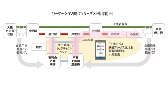 2022年11月6日から12日まで開催する「信州まるかじりワーケーション」にて『温泉MaaS』というモビリティ利用促進ツールの中で利用が可能となっており、「ワーケーション向けフリーパス」を利用して千曲市内の循環バス・鉄道が乗り放題、そしてしなの鉄道沿線6地域をお得に周遊できます。また、フリーパスの利用データについては、株式会社MaaS Tech JapanのMaaSプラットフォーム『SeeMaaS(シーマース)』を用いて蓄積・分析し、今後ワーケーションのみならず、地域住民の方も公共交通を有効利用できるサービス構築に活用していきます。これらの取り組みを通じて、公共交通を用いた人流の創出、持続可能な地域交通の形成など交通課題の解決に貢献していきます。