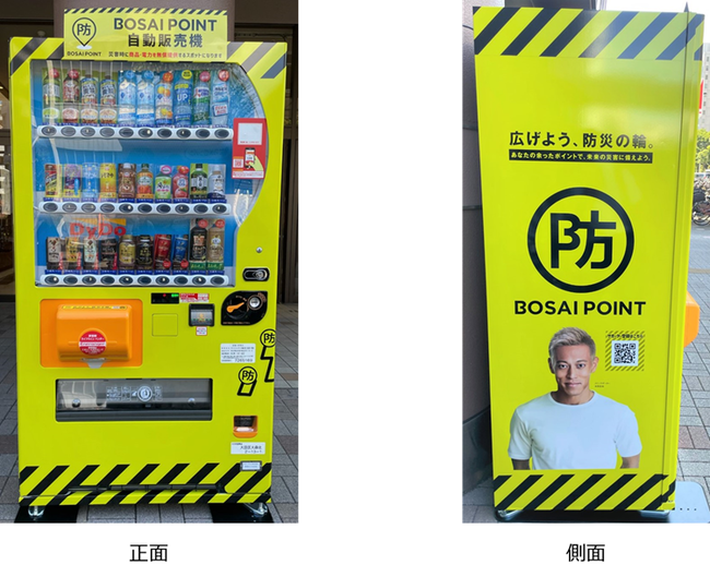 本自販機は、日本中で防災意識と寄付意識が高まり、未来の災害時の被害軽減を目的に企画されたもので、「BOSAI POINT」のメインサポーターを務める本田 圭佑氏をラッピングしたオリジナルデザインになっています。また、売上の一部を「BOSAI POINT」に寄付することで、災害への備えとして役立てられます。さらに、災害等で停電が発生した際に、人的操作で自販機内の商品を搬出することができ、携帯電話やラジオ等の非常用電源としてもご利用いただける災害救援の機能が備わっており、もしもの時に地域の皆様にお役立ていただけるものと期待しております。