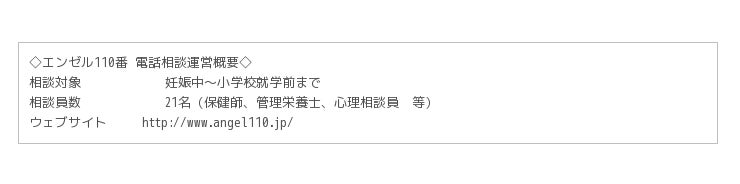 1970年代は、高度成長期に核家族が急増し、育児環境が大きく変化した時代でした。その社会状況を背景に「子育て奮闘中のお母さんたちのお役に立ちたい」という思いから、1975年5月に、無料の育児相談窓口『エンゼル110番』を開設しました。今までにお受けした電話相談は93万件を超えました(2016年9月時点)。相談内容は、「何をどれだけ食べさせればよいか」といった“食生活”や「子どもを育てる自信がない」といった“相談者自身”に関してなど多岐に渡ります。相談員は、不安・悩み・疑問を抱えた方たちの話を聴き、一緒に考えることで育児の不安を取り除くことを基本姿勢としています。