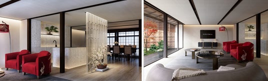 日本の伝統文化を支えてきた匠たちと、世界的な美意識を象徴するアルマーニ/カーザが出会い、普遍的な美と現代的な洗練が調和した、世界で類を見ない邸宅が誕生します。リビングには庭に向けた大開口を設け、室内と庭が一体化する設計に。白やベージュを基調とした静謐な空間に、天井や家具、ファブリックなど、アルマーニ/カーザによる設えが施されます。世界に数点しかない希少な家具も取り入れ、日本建築の余白と静けさに、世界のラグジュアリーの洗練が重なり合う空間が実現します。