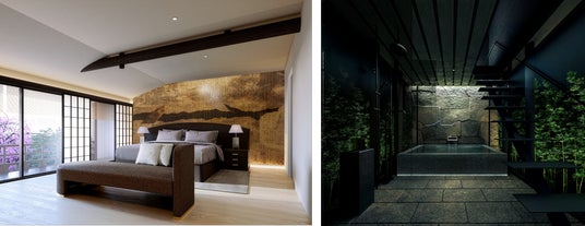 エントランスには、数寄屋造りの趣を受け継いだ吹き抜け空間を設け、京都の景観条例による制約の中でも開放感のある設計を追求。上七軒通りから自然に繋がる石畳のアプローチが内部へと連続し、黒竹を映す漆喰壁が訪れる人を静かに迎え入れます。また、離れに設けられたバスルームは、単なる入浴空間にとどまらず、外に広がる“生きた竹”と呼応することで、景観と建築が一体となる体験を創出。一日の疲れを癒し、自然と対話するような静寂のひとときを提供します。