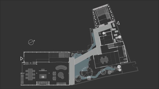 主屋と離れの間には、日本の四季の本質を凝縮した庭園が広がります。手がけるのは、日本最高峰の作庭家・小川治兵衛の系譜を受け継ぐ「御庭植治」。段落ちの滝から流れる水が池へと巡り、四季折々の自然の移ろい、そしてこの邸宅に流れる悠久の時間を映し出します。さらに庭園の上を渡る廊下を設けることで、静寂の中に大胆な構成を取り入れ、建築と自然がひとつになる空間体験を創出しています。