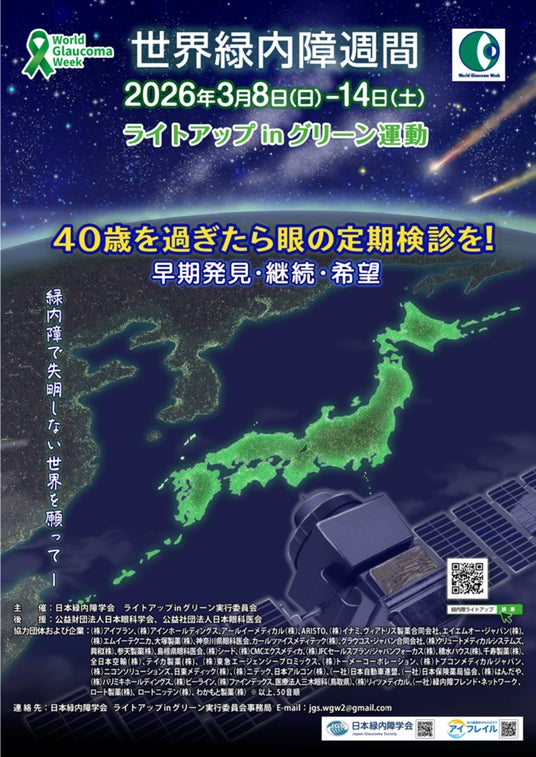 日本緑内障学会では、緑内障の認知と啓発に向けて、各地のランドマークや医療施設等をグリーンにライトアップする「ライトアップinグリーン運動」を、世界緑内障週間(2026年3月8日~14日)に合わせて展開いたします。