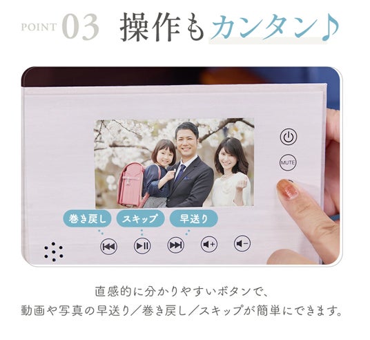 直感的にわかりやすいボタンで、動画や写真の早送り/巻き戻し/スキップが簡単にできます。