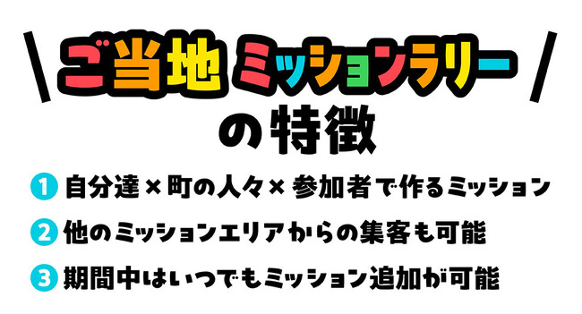 ご当地ミッションラリーでは、イベントエリア内の観光施設、民間企業、飲食店などをつなぎ、各スポットに設定されたミッションをすることで、利用者が何気なく通り過ぎていた場所、中々訪れる機会がなかった場所を探索する体験に誘導する。ミッションをクリアし、ご当地ポイントを集めてランクアップすることでご当地マスターを目指す。 さらに店舗によってはクーポンやサービスを受け取ることもできる。