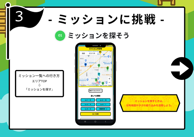 例として、「名物チキンを食べて報告ワードを教えてもらおう」「公園内に生き物が書かれたプレートが1枚だけある。その生き物は何」「石碑の裏にかかられた数値をすべて足すといくつになる?」など一筋縄ではいかないミッションが用意されている。オンラインマップサービスでは確認できず、実際に現地に行くことで解くことができる。また、施設や店舗にて回答画面を提示することで、サービスを受けいれるなどの仕掛けをし、民間企業や飲食店などを巻き込んでいくことも可能になっている。