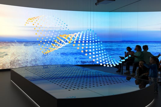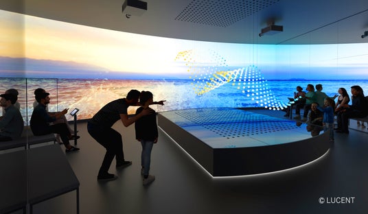 *キネティック・ライト・ビジョン(KLV : Kinetic Light Vision):極細ワイヤーで球体を吊り下げ、半透明のアクリル球体1つ1つに特殊な照明を投光。極めて滑らかなモーター制御によって上下に動かすことで、空間内に球体が浮遊しているかのような表現を可能としたLUCENT独自の空間表現システム。わずか0.2度という超挟角の特殊なフルカラー制御照明を専用に開発。繊細なモーションと、色彩豊かな照明による光の球体が作り出す世界初の空間システム。(特許出願中)