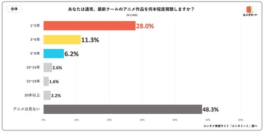 全国の10代~50代の2,000人の男女を対象に、「あなたはいつも、最新クールのアニメ作品を何本程度視聴しますか?」というアンケートを実施したところ、最も多かった回答は、「アニメは見ない」で48.3%でした。次いで、「1~2本」が28.0%、「3~4本」が11.3%で続く結果になりました。また、10本以上見ていると回答した方は合計で6.4%にとどまっています。