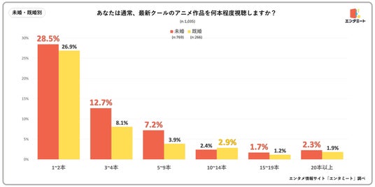 未婚・既婚別で見ると、ほとんどの項目で未婚者の回答率が既婚者を上回る結果となりました。このような傾向が生まれる理由として、既婚者では未婚者に比べて子供がいる方が必然的に多くなると考えられ、プライベートの時間を家族と共有していることから、自分1人の時間を確保することが難しくなっていると考えられます。ただ、1クールに10本以上視聴するようなヘビーなアニメファンの方の場合、未婚・既婚で大きな差はついておらず、生活の中で工夫してアニメを視聴する時間をつくっているのかもしれません。