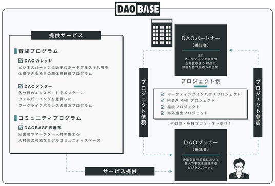 事業内容:プロジェクトジョブ型組織によるインハウス支援、プロ人財育成型コミュニティ「DAOBASE」の運営