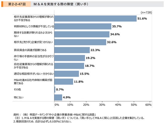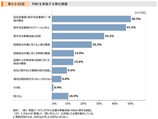 また、企業のM&Aが加速する中、PMIに課題を抱える企業が増えています。特に問題になりがちなのがシナジーを生み出すために必要な価値観の不一致です。買収した側と買収された側の人材は価値観やビジョン、風土等が異なるため衝突しやすく、設定した事業計画を達成する前に人材面でトラブルを抱えてしまうケースが多いという調査結果※6があります。